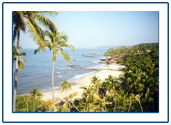 Across the river, a fair distance away, is a headland that separates the two parts of the most photographed beach in Goa: the beautiful Vagator. Its northern half fronts a bay that curves from the headland to the hillock crowned by the Chapora Fort. Between the headland and the hillock, surf spreads in skirts of white lace and the palms stand far back from the water. At the tip of the headland are groups of sea-washed rocks popular with honeymooners and others who want to be left alone. To the south of the headland are more outcrops of rocks cupping little pockets of sand and interesting tidal pools. And on the headland you d find snack stalls, coconut sellers, and persuasive peddlers of trinkets and shells.