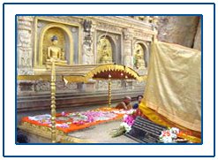 Buddha Gaya is also home to the ancient temple of Buddha. The Mahabodhi temple has a 150 feet high tower, and it contains a gilded image of Buddha. The original shrine here is believed to have been raised by Emperor Ashoka. The temple has a beautiful stone railing around it. Depcited on the walls of the temple are scenes from Buddha's life. A museum in the vicinity has gold, bronze and stone images of Buddha.