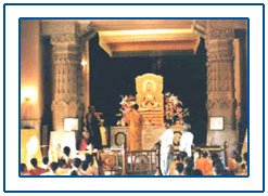 The entrance of the vihar is dominated by a huge bell, a gift